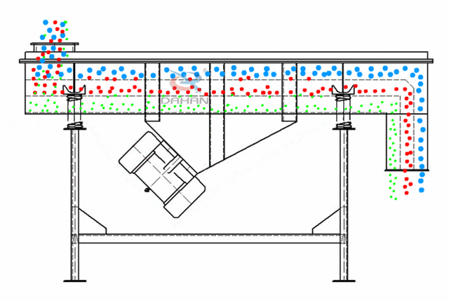 原理是利用振動電機激振器作為振動源,使物料在篩網(wǎng)上被拋起,同時向前作直線運動,物料從給料機均勻地進入篩分機的進料口,通過多層篩網(wǎng)產(chǎn)生數(shù)種規(guī)格的篩上物、篩下物、分別從各自的出口排出。