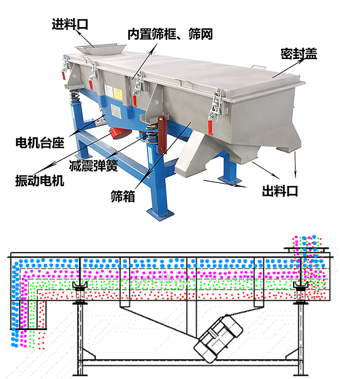 直線篩于直線振動篩是一樣的產品其結構可簡單分為:進料口、篩機蓋、篩板、出料口、彈簧和電機。