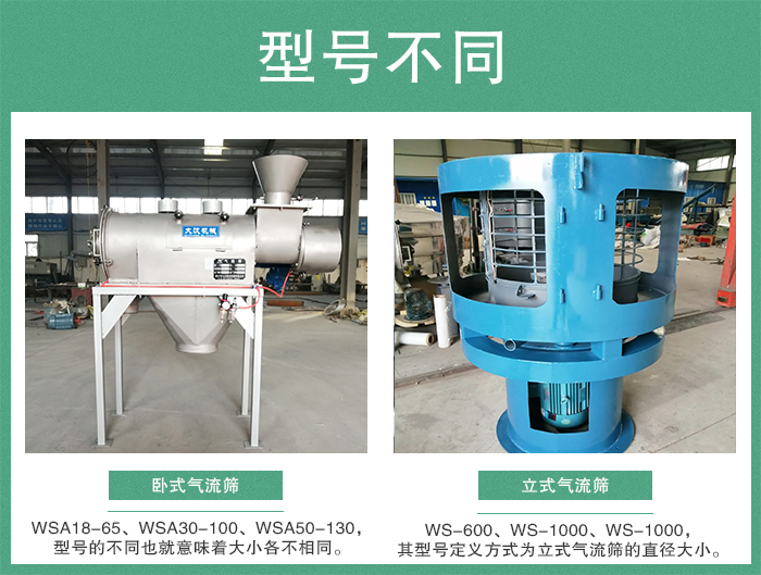 臥式氣流篩:WSA18-65、WSA30-100、WSA50-130,型號的不同也就意味著大小各不相同。