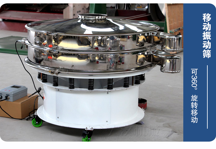 該設備底部加裝萬向旋轉(zhuǎn)輪,可360°旋轉(zhuǎn)移動,所以稱之為:移動振動篩