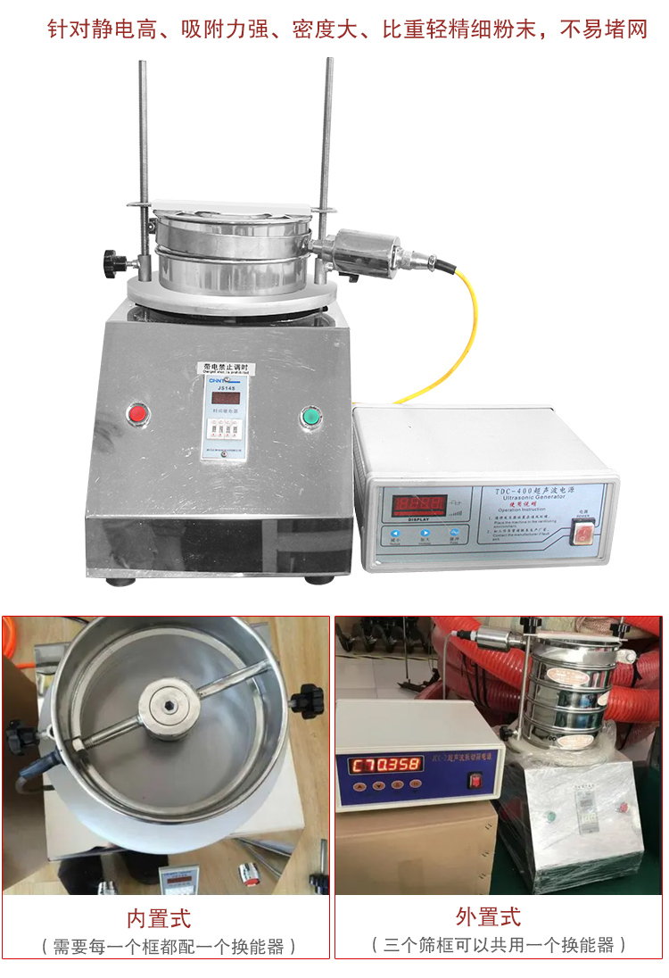 在標準檢驗篩基礎上增加了超聲波篩分系統(tǒng),解決了篩分200目以上高目數(shù)產(chǎn)品或普通檢驗篩難以篩分的易結塊、易帶靜電的產(chǎn)品的難題,并防止篩網(wǎng)堵塞。