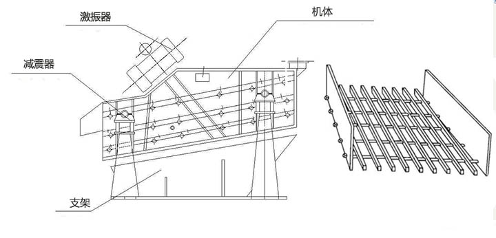 棒條篩篩面是由一組相互平行的彈簧棒條和安裝棒條的固定梁等組成的,鋼棒采用65Mn,55CrSi,60SiMn等彈簧鋼,一段插入口形固定梁,另一端懸臂形成條形篩孔,棒條的長(zhǎng)度設(shè)計(jì)在220-360mm之間。該設(shè)備主要適用于破碎機(jī)前大塊物料的均勻給料,以及垃圾的篩分處理等行業(yè)中。