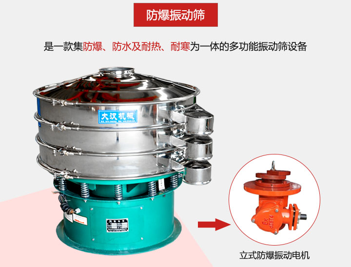 防爆振動(dòng)篩是針對(duì)一些易產(chǎn)生爆炸行業(yè)的研發(fā)設(shè)計(jì)而成,是一款集防爆、防水及耐熱、耐寒特殊要求的場(chǎng)合為一體的多功能振動(dòng)篩設(shè)備,能夠?qū)崿F(xiàn)該功能主要原因是防爆振動(dòng)篩采用的是立式防爆振動(dòng)電機(jī)。